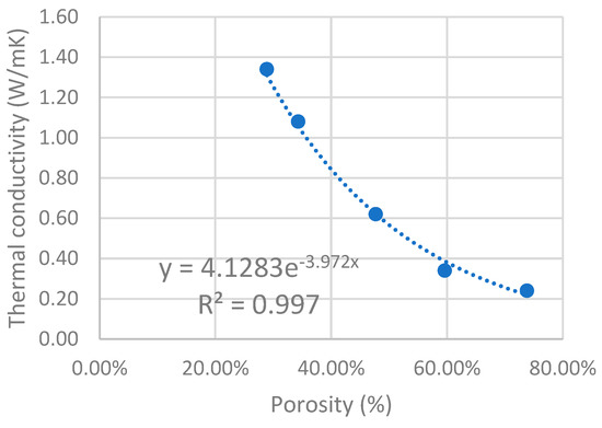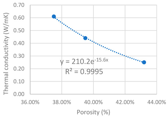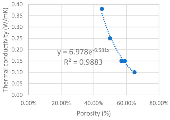 The mortars studied by Barros [17] containing vermiculite contents of 0%, 3%, 7%, 15%, and 34% reached porosity values ranging from 28.90% to 73.80%. The increase in porosity caused a reduction in the thermal conductivity from 1.34 W/m·K to 0.24 W/m·K (Figure 14). As observed by Palomar et al. [43], the results from Barros’s study (2018) [17] also reached a very good correlation between porosity and thermal conductivity (Figure 15). The function that best explained this correlation between these two variables is the exponential equation, which obtained a coefficient of determination equal to 0.997.