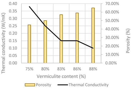 Low (1984) [40] proved the influence of the size and packing of particles on thermal conductivity and the potential use of vermiculite in elements for construction. The author observed that the use of smaller particles of vermiculite provided a lower thermal conductivity than when using the same particles pressed to form a rigid element; in addition, the strength also decreased. A combination between vermiculite and binder was recommended to obtain a resistant material and low heat conduction.