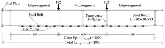 General geometry of the modeled HFRP–steel beam with a double clear span.