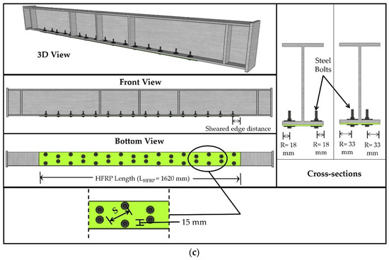 All HFRP strips had a minimum sheared edge distance “Sh” of 50 mm, as recommended by Sweedan et al. [24]. Meanwhile, rolled edge distances “R” of 25 mm and 18 mm were maintained in all beams with uniform and staggered bolt arrangements, respectively. For illustration purposes, schematic views of selected beams are shown in Figure 2. The steel bolts were used to attach the HFRP strips to the bottom flange while maintaining a proper match between the holes on the HFRP strip and the bottom steel flange, as shown in Figure 3. The beams were simply supported on cylindrical bearing blocks spaced at 1800 mm. A built-up spreader beam was used to transfer the load from the hydraulic actuator to the tested beams while maintaining a spacing of 600 mm between the two loading points (see Figure 4).