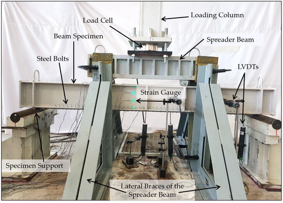 Six LVDTs were used in each beam to monitor the vertical and lateral displacements during testing (see Figure 5). The vertical deflections at four locations along the beam span were recorded using LVDT-1 to LVDT-4. Additionally, two LVDTs were positioned perpendicular to the beam web to monitor the lateral deflection of the specimens. It is worth mentioning that the load-deflection curve of each specimen was generated using LVDT-1, which was located at the mid-span. A 500 kN MTS hydraulic actuator was used to apply the load in a displacement-controlled scheme with a rate of 1.5 mm/min. Testing was terminated whenever an excessive deflection of 60 mm was reached or at the failure of the steel bolts.