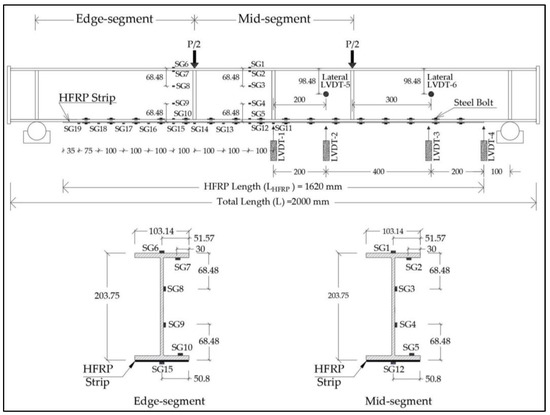All the specimens were instrumented with electrical resistance strain gauges across the beams’ sections and along the HFRP strips. A schematic showing the locations of the strain gauges on U90S100 is displayed in Figure 5. It is worth noting that the numbers and locations of the mounted gauges differed according to the length of the HFRP strip and the spacing between the bolts. After mounting the strain gauges, a protective coat was used to cover the gauges and protect them from exposure to any external effects.