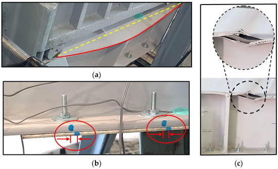 Neither of the replicates of U45D35 experienced major LTB or FLB; yet, they failed by bolt shear fracture (BSF), as shown in Figure 8a, due to the insufficient number of bolts utilized to transfer the interfacial shear from the steel flange to the two short HFRP strips. Once the shear strength of the bolt was reached, the bolt experienced shear fracture, marking the failure of the system. The experimental observations revealed bending in the edge bolts before fracture, as presented in Figure 8b. Despite the undesirable brittle failure of U45D35, average enhancements of 10.3% and 8.5% in the yield and ultimate flexural capacities were calculated compared to the CB.