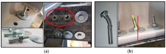 (a) Shear fracture of the bolts in U45D35; (b) bending of the bolts in U45D35.