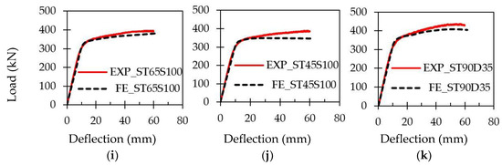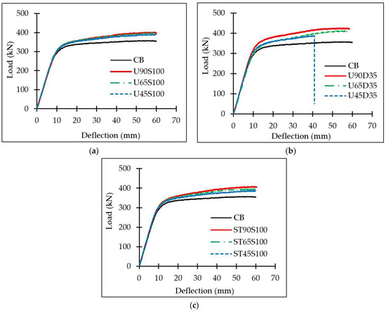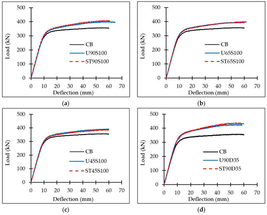 The load-deflection curves of the beams strengthened by different lengths of a single HFRP strip bolted by staggered steel bolts are displayed in Figure 9c. The plots highlight the improved performance associated with increasing the length of the HFRP strip. The beams ST45S100, ST65S100, and ST90S100 showed 5.2%, 7.5%, and 8.5% enhancements in the yield load compared to the CB, respectively (refer to Table 2). Meanwhile, the calculated improvements in the ultimate loads of ST45S100, ST65S100, and ST90S100 compared to the CB were 8.5%, 10.6%, and 14.2%, respectively. Increasing the length of a single HFRP strip bolted by staggered steel bolts from 45% to 90% of the beam span slightly improved the yield and ultimate loads of the strengthened beams by 3.1% and 5.3%, respectively.