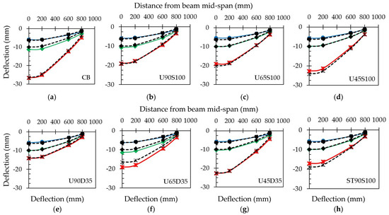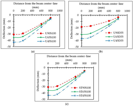 The effect of the HFRP length on the serviceability, in terms of the deflection, was assessed by comparing the deflection profiles along the span of the grouped beams at a fixed load value of 380 kN, which is slightly lower than the peak load of all the beams, as shown in Figure 10. Increasing the length of the HFRP strip reduced the beam deflection, implying better serviceability, which was more notable at high loads. It is worth noting that the mid-span deflection of U90S100 at 380 kN (see Figure 10a) was 28.7% lower than that of U45S100. Similarly, the mid-span deflection of U90D35 showed lower measurements than that of U45D35 by 51.2% (refer to Figure 10b). Moreover, the measured mid-span deflection of ST90S100 at 380 kN was less than that of ST45S100 by 30% (see Figure 10c). Increasing the length of the HFRP strip increased the number of utilized steel bolts at the bottom flange and, consequently, enhanced the system’s stiffness and resulted in lower deflection at high loads.
