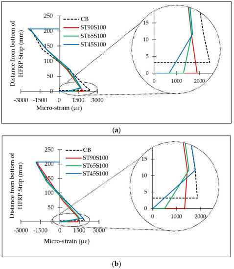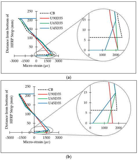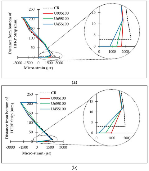 The effect of the HFRP length on the tensile strains of the strengthened beams was analyzed in view of the strain profiles along the depth of the beam. The measured tensile strains at the mid-segment and edge-segment of U90S100, U65S100, U45S100, and the CB at 310 kN are plotted in Figure 11. The bolted HFRP strips effectively reduced the strains in the tension side compared to the CB. It is visible in Figure 11 that the effectiveness of the bolted HFRP strips in reducing the tensile strains was more pronounced at the mid-segment than at the edge-segment. This observation implies that the combined shear and flexure stresses at the edge-segment limit the effectiveness of the bolted HFRP in enhancing the flexural performance of the strengthened beams. The % utilization of the HFRP strength (%UσHFRP), as displayed in Table 3, is calculated as follows: