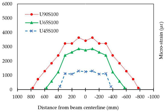 The distributions of the flexural strains along the span of the HFRP strip of U90S100, U65S100, and U45S100 at 380 kN are displayed in Figure 14. It should be noted that the strain gauges instrumented only half the span of the tested beams; however, the symmetry maintained in the beam geometry and the loading conditions enabled the mirroring of the recorded strains over the beam centerline to provide a better presentation of the strains along the full length of the bolted HFRP strips. The plotted flexural strains showed a similar trend to that of the distribution of the bending moment diagram of a simply supported beam subjected to four-point loading with minor disturbances. This agrees with the reported findings for bonded FRP–steel beams [38,39,40,41]. The plotted disturbances can be attributed to the effects of the random distribution of the glass fibers within the HFRP strip. Figure 14 shows a better contribution of the long HFRP in resisting the applied loads, as is made evident by the higher strain measurements along U90S100 compared to those recorded in U65S100 and U45S100 at any specific distance from the beam centerline.