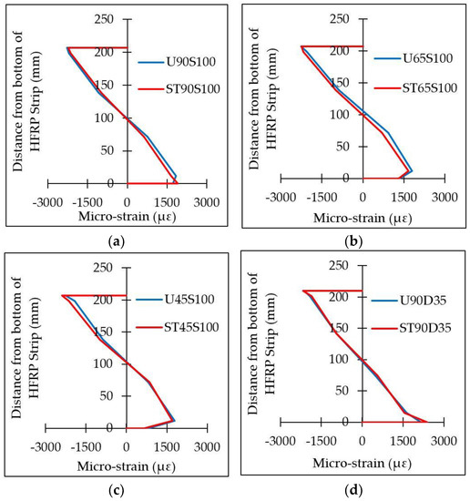 Figure 16 displays the strain profiles at the mid-segments of the configuration pairs at 310 kN. Although ST90S100 showed slightly better compatibility and lower slippage than U90S100, the remaining specimens showed that the bolt arrangement had an insignificant effect on the strain distribution. Comparing the %UσHFRP of the configuration pairs in Table 3 indicates a similar utilization of the HFRP strip regardless of the bolt arrangement in both segments.