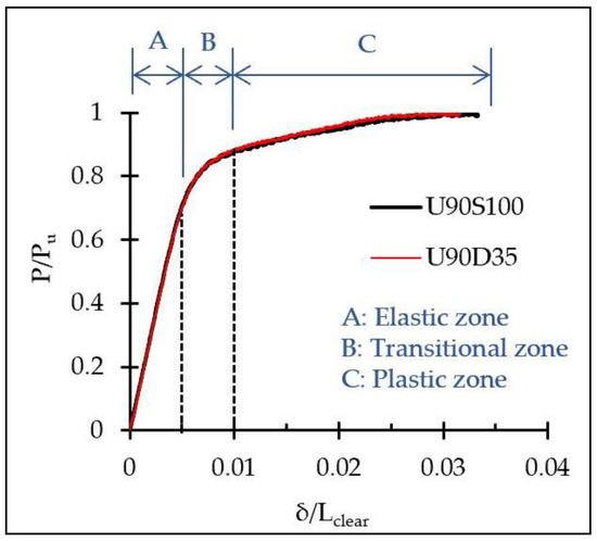 Simplified empirical equations characterizing the load-deflection relation of the strengthened beams were developed based on the experimental records discussed in Section 3. The proposed equations are presented in a normalized form where the ordinate is calculated by dividing the experimental load by the ultimate load of the respective configuration (P/Pu). Meanwhile, the abscissa is presented by dividing the recorded deflections by the beam clear span (δ/Lclear), where Lclear equals 1800 mm. The corresponding generalized curves are shown in Figure 17 for sample configurations. These plots are characterized by three distinct zones, namely the linear elastic zone that extends till the onset of yielding at δ/Lclear = 0.005 (zone A); the plastic zone (zone C) that corresponds to δ/Lclear ≥ 0.01; and the transitional zone (zone B) between the two former zones where propagation of the yielding takes effect. The values of the normalized ordinates (P/Pu) along with the corresponding abscissas (δ/Lclear) for all the specimens were incorporated into MATLAB to generate empirical equations that best fit all three zones, resulting in the following: