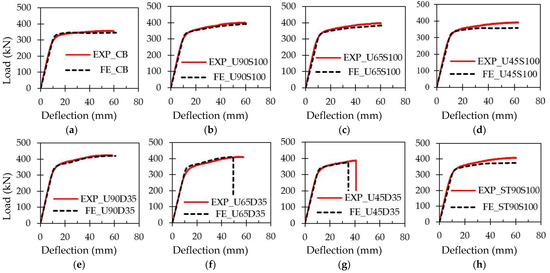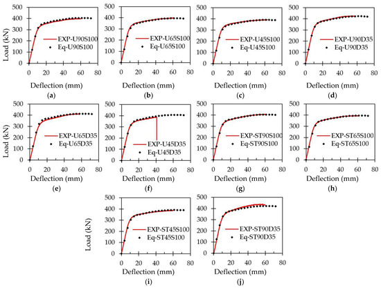 where (Pu) is the ultimate load of the strengthened system in kN, (LHFRP) is the length of the HFRP strip in mm, (Lclear) is the clear span of the beam in mm, (S) is the spacing between the steel bolts in mm, and (D) is the diameter of the bolt hole in mm, which is 2 mm larger than the bolt diameter. It is worth noting that the arrangement of the steel bolts was not incorporated in the empirical equations due to its negligible effect on the ultimate load of the strengthened beams, as discussed in Section 3.3. Similarly, the thickness of the HFRP was not integrated into the proposed equations due to its insignificant influence, as reported in [34]. Table 4 shows a comparison between the experimental and empirical ultimate loads, with a maximum difference of less than 2% with the exception of the U45D35 specimen, which had an error of 5.7%. The adequacy of the proposed empirical equations was further validated against the experimental measurements of all the tested specimens, as shown in Figure 18. The plotted curves confirm the good agreement between the experimental and the empirically predicted load-deflection curves.