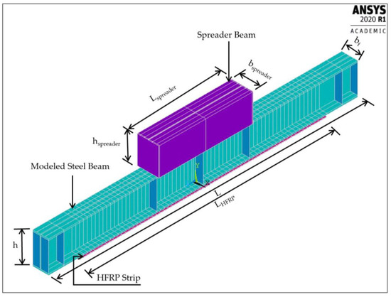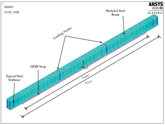 A detailed three-dimensional (3D) numerical model was developed using the multipurpose finite element (FE) software ANSYS (2020 R1) [42] to simulate the performance of the strengthened HFRP–steel beams. Detailed descriptions of the model geometry, material modeling, and boundary conditions are outlined hereafter. The accuracy of the developed FE model was verified by comparing the load-deflection curves, deflection profiles, and failure modes of all the tested specimens with their counterparts from the finite element model. Finally, a parametric numerical study was conducted using the verified model to assess the effectiveness of the fastening technique when considering a wide range of parameters, including HFRP thickness, bolt spacing, steel grade, loading scheme, and beam length.