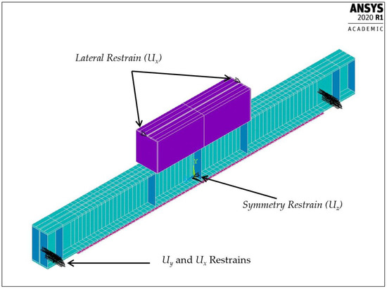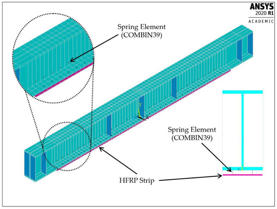 The general geometry of the modeled HFRP–steel beam with the spreader is shown in Figure 20. The geometry was defined using a global Cartesian coordinate system with its origin located at the external surface of the bottom steel flange at the beam’s mid-span. The beam depth was directed along the Y-axis, while its span was parallel to the Z-axis. The main geometrical parameters of the beam were its length (L), clear span (Lclear), flange thickness (tf), flange width (bf), web thickness (tw), and web height (hw). Additionally, 12 mm thick endplates and stiffeners were modeled at the locations described in Section 2. Meanwhile, the geometry of the modeled HFRP strip was defined by its width (bHFRP), thickness (tHFRP), and length (LHFRP). The COMBIN39 element was introduced at the bolt locations to model the connectivity between the steel beam and the HFRP (see Figure 21). The COMBIN39 element was defined by stiff springs in the X- and Y-directions to simulate the zero-loading in the X-direction and to reflect the restrictions imposed by the clamping forces in the Y-direction. Meanwhile, the interfacial behavior at the HFRP–steel interface was modeled using the non-linear COMBIN39 spring directed in the Z-direction with a profile that matches the load-slip model shown in Figure 19.