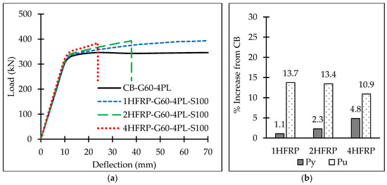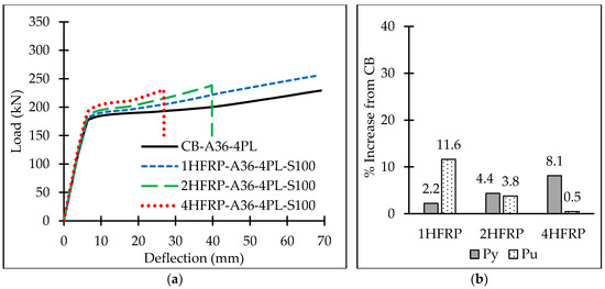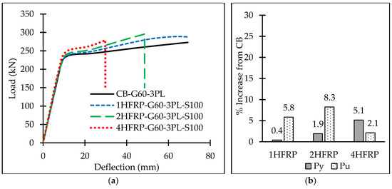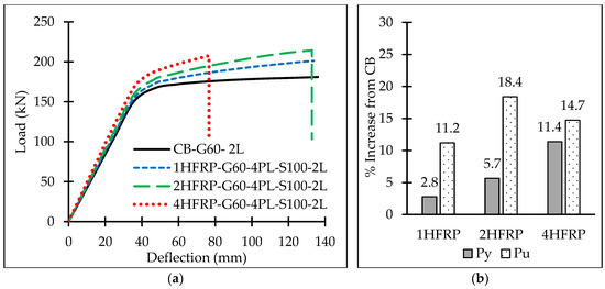 The beams U45S100, U65S100, and U90S100 showed 4.9%, 5.8%, and 8.6% improvement in the yield capacity compared to the CB, respectively. The load-deflection curves of these specimens in Figure 9a reveal similar ductile behavior, with 11% average enhancement in the ultimate flexural capacity compared to the CB. Although the performance of this group of beams showed considerable improvements in the yield and ultimate flexural capacities compared to the CB, increasing the length of the HFRP strip from 45% to 90% of the beam span resulted in only 3.5% and 2.0% enhancements in the yield and ultimate strengths, respectively.