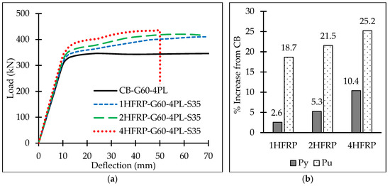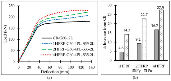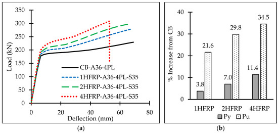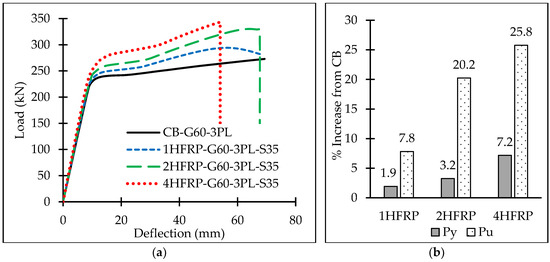 Performance of beams in 3PL with 35 mm spacing: (a) load-deflection curves; (b) % increase in yield and ultimate loads from CB.