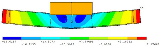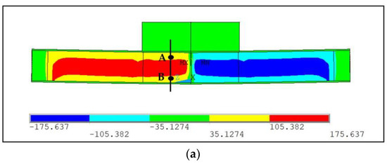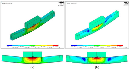 The beams subjected to 3PL showed lower ultimate load-carrying capacities than those in 4PL, as shown in Figure 37, at both spacing values. This observation agrees with the findings in [48,49,50] for different materials tested in 3PL and 4PL schemes. The combined effects of the flexure and shear stresses in the vicinity of the loading point in the 3PL scheme resulted in higher stresses in the beam compared to the 4PL scheme. A proper clarification of the differences between the two loading schemes (i.e., 3PL and 4PL) is provided in view of the generated stresses and their distribution along the beam. Figure 38 shows the shear stresses in the ZY-plane and the flexure stresses in the Z-direction of the CB under 3PL at 240 kN. Consider two elements from the web at the mid-segment of the beam where points “A” and “B” are located above and below the neutral axis, respectively. The stresses in element “A” involve both shear and compressive flexural stresses, whereas the stresses in element “B” display shear and tensile flexural stresses. Meanwhile, in the 4PL scheme, the stresses at the same locations are flexural stresses only, as shown in Figure 39 for the CB in 4PL at 340 kN. The absence of the shear stresses in the mid-segment under 4PL preserved the nominal capacity of the beam and enabled the carrying of higher loads. In other words, the high flexure stresses generated in the 3PL () reduce the effective area of the web that resists the shear stresses as the flexure stresses penetrate gradually from the flanges into the web [51]. Meanwhile, the application of 4PL generates lower flexure stresses at the same load (), enabling the web to preserve its shear capacity to support the structural element at higher loads.