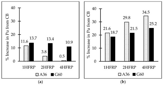 Figure 43 compares the percentage increase in the ultimate load of the CB calculated for the long beams with double the clear span to those of the reference set. The ultimate load enhancement for the long beams utilizing a single HFRP strip was slightly lower than that calculated for the short beam at both spacing values as the system’s failure in the long beam was governed by the steel material. Meanwhile, increasing the thickness of the HFRP strips in the long beam showed a slight improvement in the ultimate load compared to the short beam at both bolt spacing values. It is worth noting that the increased number of bolts in the long beams enhanced the bearing between the fastened components and the ductility of the system. The effect of the improved ductility was more apparent in the thick HFRP strips (2HFRP and 4HFRP), causing higher improvements in the ultimate load of the long beams than the short beams. In general, the differences in the enhancements of the ultimate loads when considering the long and short beams are insignificant.