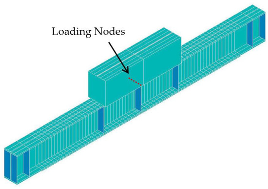 The effectiveness of applying the fastening technique for steel beams with double the clear span tested experimentally in Section 3 was also investigated. The geometrical parameters of the verified FE model were adjusted to model a steel beam with a clear span of 3600 mm while maintaining similar material modeling and boundary conditions. The modeled beams were subjected to 4PL, where the loading nodes were located at 600 mm to the left and the right of the mid-span, as shown in Figure 40. The stiffeners were modeled at the supports, at the mid-span, below the loading points, and at the beam ends in a similar layout to the verified model. It should be noted that the HFRP length in the strengthened beams was increased to maintain a length that was 90% of the clear span. Accordingly, the number of steel bolts was increased to properly fasten the entire length of the HFRP strip to the bottom flange while maintaining a constant spacing between the bolts and a constant shear-edge distance of 50 mm. The effects of the HFRP thickness and the spacing between the bolts were also investigated for the long beams. The designation of this set of beams ends with “2L” to reflect the doubled clear span of the beam relative to the tested specimens.