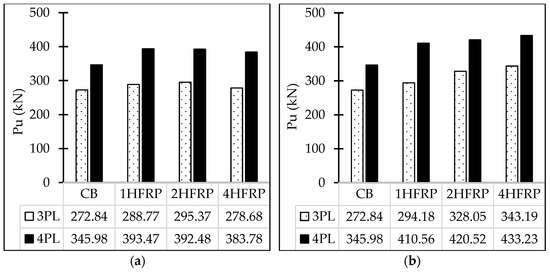 Ultimate loads of beams subjected to 3PL and 4PL at: (a) 100 mm and (b) 35 mm spacing between bolts.
