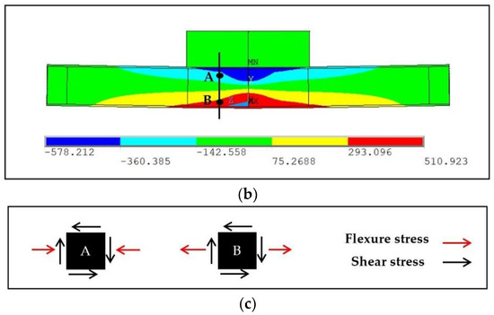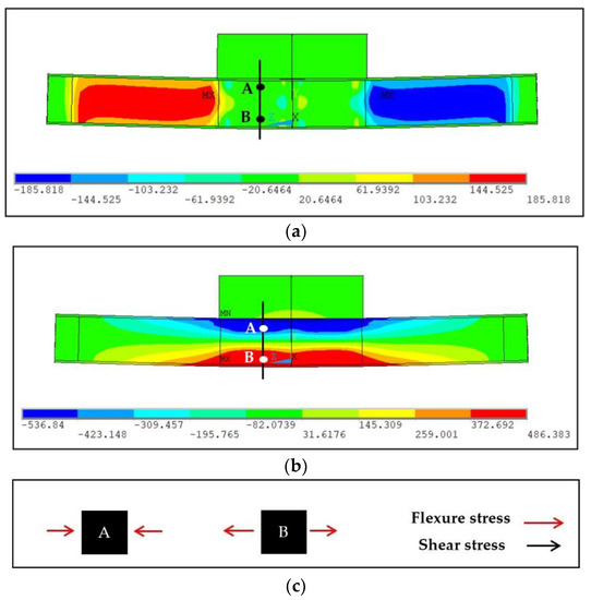 FE stresses in CB in 4PL at 340 kN: (a) shear stresses in YZ-plane; (b) flexure stresses in Z-direction; (c) stress elements at points A and B.