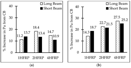 Effect of the beam length on ultimate load-carrying capacity with different HFRP thicknesses at: (a) 100 mm and (b) 35 mm spacing between bolts.
