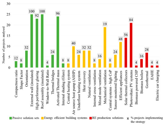 In projects relying on passive solutions, 10 different strategies were noted (Table 1). Although variable in their impacts, the passive strategies were shown to be the most effective in achieving the low/zero level of energy consumption. For example, in all 25 analyzed projects, a high-performance building envelope was employed, allowing the thermal mass of walls and ceilings to compensate for the heating/cooling requirements, and was further accompanied by high-performance glazing and airtightness (used in 23 and 6 projects, respectively). However, measures relying on the modifications of building form (such as shape and compactness ratios, window-to-wall ratio (WWR), and internal shading) were adopted in less than 12% of the projects.