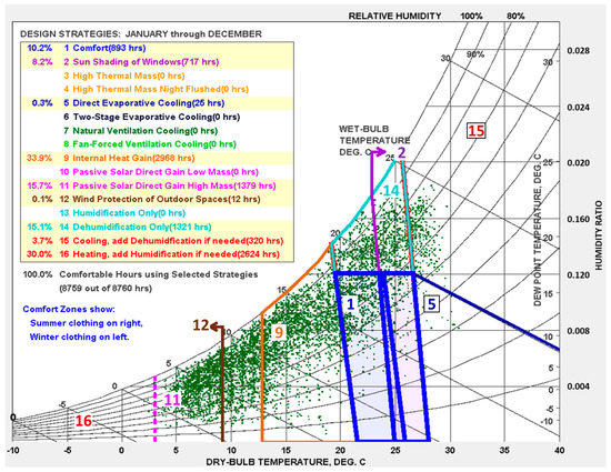 The chart shown in Figure 4 outlines the following zones: a comfort zone (1), passive heating zones (9, 11, 12, 16), and passive cooling zones (2, 14). As noticed in Figure 4, strategy 2 outlines the provision of window shading taking up to 8.2%, which amounts to 717 uncomfortable annual hours. Hence, 717 h of comfort may be provided through implementation of appropriate shading devices. Only 0.3% of annual comfortable hours is achieved through direct evaporative cooling (strategy 5), adding up to 25 comfortable hours. About 33.9% of the thermal occupant comfort is achieved by harnessing the potential of internal heat gained (strategy 9) within the building through artificial lighting, electric equipment, or occupant internal activities. This includes about 2968 h annually. Using strategy 11, thermal comfort is achieved through passive solar gains. This includes about 1379 h (15.7%). For about 1321 h, thermal comfort is achieved through strategy 14, dehumidification only (3.7%). A 3.7% level of discomfort (320 h.) may be removed using both the cooling and dehumidification (strategy 15) at the same time. To achieve thermal comfort, strategy 16 requires both the increase in air temperature through mechanical heating along with humidification to achieve 2624 h of comfort (30.0%). Clearly, a relatively small comfort zone (10.2%) for the building implies that both passive and active design strategies are needed to meet the heating and cooling requirements.