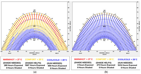During the winter and spring months, the sun is needed for 1919 h, along with 273 comfortable hours, whereas only 265 h of shading and 858 h of direct radiation are needed during summer (Figure 5). Hence, buildings in Nice require shading for only 268 h, while the availability of 2777 h of solar exposure must be ensured to maximize the solar heat gains during winter. Furthermore, the solar charts justify the need for passive heating at temperatures below 20 °C. Therefore, with these low ambient temperatures requiring direct solar radiation even during summer, it is imperative that greater efforts be concentrated on developing passive heating strategies.