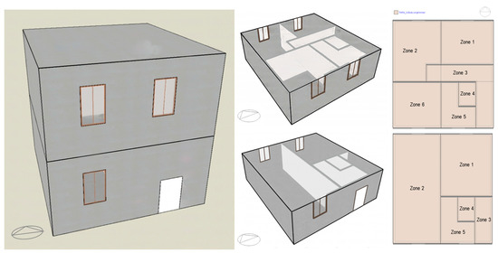 Based on age band and sub-types, a medium-sized single-detached two-story “Puccini” house was chosen for modeling the baseline energy consumption representing the French housing stock [45,47] (Figure 6). This simple house designed for a medium-sized family of three to six members consists of the main living room, three bedrooms, one shared bathroom, and a kitchen. Since the French thermal regulations were not implemented until 1974 [35], the Puccini (built pre-1974) building layout was considered equivalent to non-insulated construction, as detailed in Table 2 [35,45].