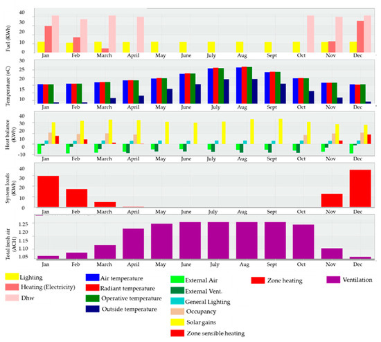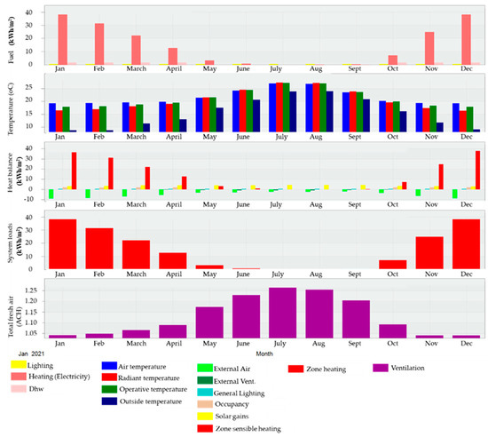 The baseline simulated energy consumption (Epuccini) of the Puccini house with the original building envelope, natural ventilation strategy, and a radiator heating system connected to the grid is 194.37 kWh/m2/year. Using the baseline, the breakdown of the annual space heating, cooling, and lighting consumption was estimated at 181 kWh/m2/year, 0 kWh/m2/year, and 6.21 kWh/m2/year, respectively. The site energy of 194.37 kWh/m2/year denotes the energy consumed by the building that is reflected in the utility bills, while the source energy of 699.55 kWh/m2/year represents the contribution of the district heating system. With a net conditioned area of 89.23 m2, the breakdown of the monthly energy use reflecting the heating, cooling, lighting, domestic hot water, appliances, and plug loads is displayed in Figure 9.