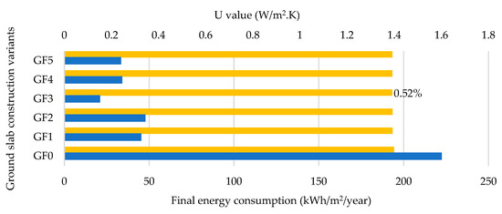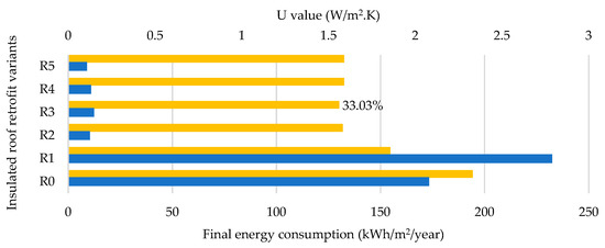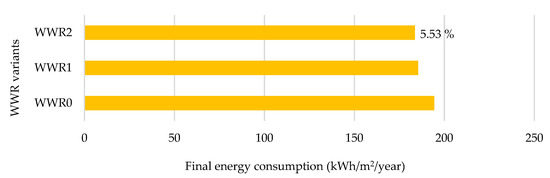 - Implementation of high-performance building envelope through a thermally insulated external wall (46.82%), upgraded airtightness (20.39%), thermally insulated pitched roof component (33.03%), and high-performance window type—glazing system (3.35%) with maximized WWR (5.53%);