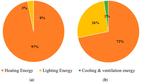 Comparative distribution of energy use: heating, cooling and ventilation, lighting: (a) Epuccini; (b) Epassive.