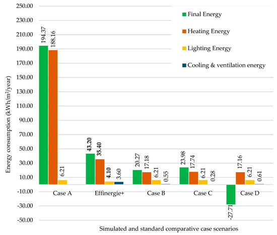 An NZEB is developed with the primary energy generation of −27.69 kWh/m2/year to meet the primary energy demand of 23.98 kWh/m2/year as plotted in the ZEB challenge graph (Figure 17). A graphical representation of the total energy breakdown of the energy uses—heating, cooling, ventilation, lighting, and PV generation—shows that maximum final energy reduction of 90% is obtained in Case B, followed by an increase of 15.47% in Case C where the energy consumption is met by PV production. Accordingly, the heating energy shows the largest reduction by 90.8%, with constant lighting energy demand for all the cases. The contribution of heating system demand is reduced from 97% to 72%, while the remaining 26% and 2% are occupied by the lighting and cooling-ventilation energy demands respectively (Figure 18).