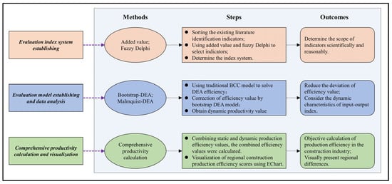 In this study, two research questions should be addressed: (1) how to reasonably build the input–output index system to evaluate the production efficiency of the construction industry, and (2) how to improve the traditional evaluation model in order to obtain the objective value of the production efficiency of the construction industry. Therefore, in order to achieve the objectives of this study, as shown in Figure 1, the research framework can be divided into three different stages: index sorting and establishing an evaluation index system, the rectification of static production efficiency, and a solution of the comprehensive production efficiency.