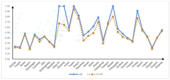 In order to more intuitively display the difference between the results obtained before and after the correction, Figure 2 compares the average production efficiency values calculated by the two models. In addition, it shows that the variation trend of the production efficiency value curves that are calculated by the two methods is the same. However, great differences appear at the peak, and the production efficiency value after the correction by the bootstrap-DEA model is significantly smaller than that obtained by the traditional DEA model. It can be seen from the combination in Figure 2 that 4 of the 31 decision-making units are valid for DEA, namely, Jiangsu, Zhejiang, Fujian, and Hainan, whereas the remaining 27 provinces and cities are invalid. The proportion of DEA effective provinces and cities is only 13%. In addition, the average efficiency value of the construction industry in the central and western regions is significantly larger than that in the eastern region. The efficiency values before and after correction in Beijing, Tianjin, Shanghai, and Guangdong are all below 0.5.