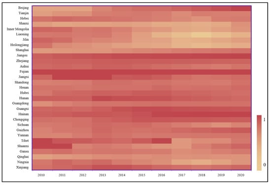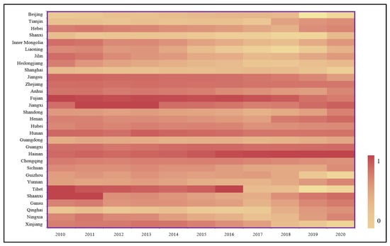 In this study, the production efficiency values of the construction industry in each province from 2010 to 2020 are visualized to form a heat map of production efficiency values. The production efficiency values are of provinces, such as Fujian, Zhejiang, Guangxi, and Jiangsu. In the last decade, they have been stable and have maintained a high level, with the average value greater than 0.6. Meanwhile, Beijing, Shanghai, Guangdong, and other provinces’ production efficiency value in the last decade has been maintained at a low level, with the average value less than 0.3. In addition, it is worth noting that Tibet, Shanxi, Fujian, Jiangxi, Xinjiang, and other places’ production efficiency values in recent years have shown a declining trend.