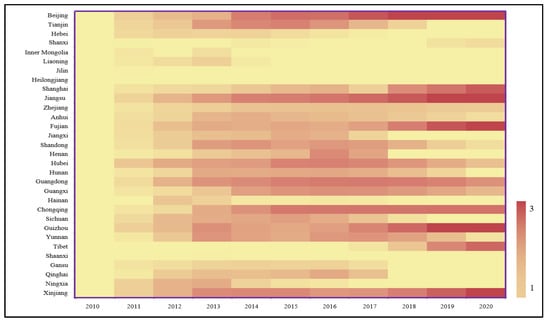 Heat map of the dynamic production efficiencies of the construction industry in 31 provinces in China.