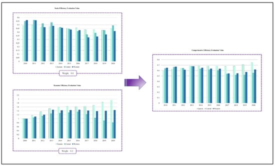 In order to visually compare the static production efficiency value, dynamic efficiency value, and comprehensive production efficiency value of the three differences, a histogram of the three production efficiency values was constructed and is shown in Figure 6.