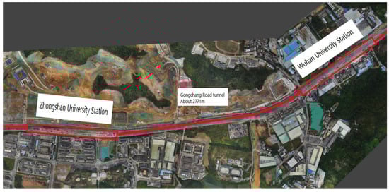 In this engineering case, the foundation pit corresponds to the Gongchang Road tunnel project and the twin shield tunnels correspond to the branch line project of Subway Line 6 in Shenzhen. The starting point of the Gongchang Road tunnel project is located on the west side of the intersection of Guangqiao Road (K0 + 000) and the project ends at Dongguan (K3 + 559.691). The open-cut method is adopted for construction, and the construction site of the foundation pit can be viewed in Figure 1. The depth and width of the foundation pit are 7–23.5 m and 29 m, respectively.