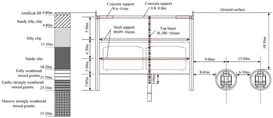 Although many scholars have analyzed the stability of tunnels and foundation pits, there are still many problems that have not been fully investigated. The mutual effect between tunnel and adjacent foundation pit is still a significant issue to be addressed. Some scholars used theoretical analysis methods to study the effect of foundation pit construction on adjacent existing tunnel deformation [,,,,,,], and some scholars analyzed the changes in the tunnel displacement field and stress field during the foundation pit construction through the use of numerical simulation method [,,,,]. Existing studies mainly performed analysis on the effects of foundation pit construction on the deformation of existing tunnels, but research on the interaction of the foundation pit and the adjacent tunnels during the simultaneous construction is fairly rare.