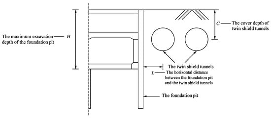 Schematic diagram of relative position between the foundation pit and the twin shield tunnels.