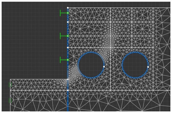 Limit analysis is the most useful method to obtain the tight bounding estimates on plastic limit load. For finite element limit analysis, the size of ‘gap’ between upper and lower bounds depends strongly upon the discretization mesh used. The adaptive mesh refinement is a formidable function of finite element limit analysis software OptumG2, which can be used for upper limit analysis and lower limit analysis to calculate strict bounding estimates. The adaptive mesh refinement is carried out by controlling the shear dissipation in this paper. Based on the direct measures of the contributions from each element to the shear dissipation, the elements that make large contributions to the shear dissipation and are thus in need of refinement are identified, and these elements are replaced successively by finer meshes to optimize the upper and lower bounds in the iterations. All analyses used five iterations of mesh adaptivity in order to obtain sufficiently strict upper and lower bounds. In Figure 6, after five iterations of mesh adaptivity, the newly generated mesh completely reveals accurately the potential sliding surface in adjacent construction of the foundation pit and the twin shield tunnels. Different colors represent different structures and soil in this figure. The blue structures show the underground diaphragm wall and shield tunnels, respectively. The green structures show the first concrete support and the second and third steel supports. The white lines represent the model grids simulating soil ground.