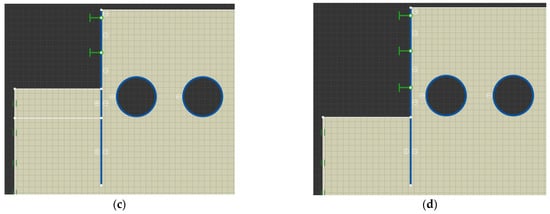 The construction scheme of the foundation pit: (a) Stage (1) (h = 0.08 H), (b) Stage (2) (h = 0.4 H), (c) Stage (3) (h = 0.75 H) and (d) Stage (4) (h = 1.0 H).