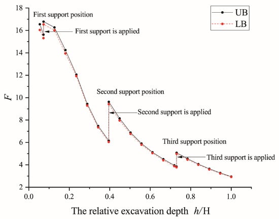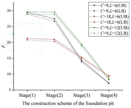 The bounding estimates of safety factor of global stability under four stages are obtained through strength reduction analysis and are presented graphically in Figure 8. It can be seen from Figure 8 that the safety factor of global stability decreases with change in stages during foundation pit construction, which means that the global stability also continues to decrease during construction process of foundation pit.