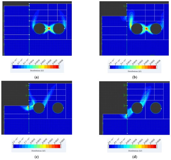 Shear dissipation contours under each stage: (a) Stage (1) (h = 0.08 H), (b) Stage (2) (h = 0.4 H), (c) Stage (3) (h = 0.75 H) and (d) Stage (4) (h = 1.0 H).