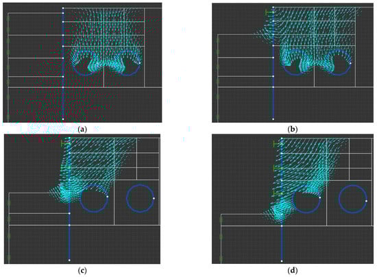 Incremental displacement vector under each stage: (a) Stage (1) (h = 0.08 H), (b) Stage (2) (h = 0.4 H), (c) Stage (3) (h = 0.75 H) and (d) Stage (4) (h = 1.0 H).