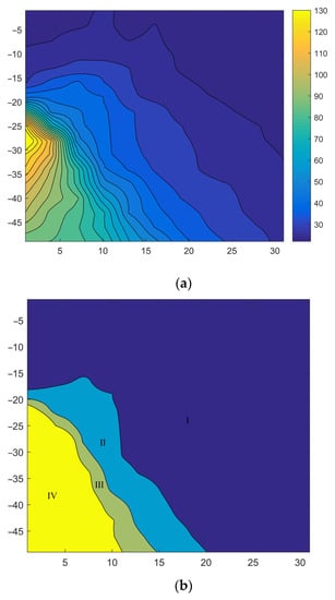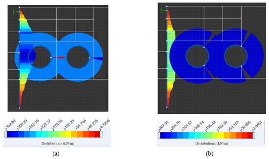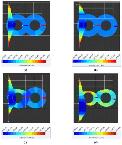 In Figure 17 and Figure 18, the different colors of the axial force diagram represent the value of the axial force. The absolute value of the axial force is larger when the color of the shear dissipation contours is more approximate to blue. According to Figure 17, at stage 2, L = 0.33 H, the failure mode is mainly the joint failure of the enclosure structure and shield tunnel segments. The maximum value of axial force in each working condition appeared near the enclosure structure. As can be seen from Figure 18, in stage 4, the extreme value of axial force of the enclosure structure appeared at the elevation of the bottom plate, and the extreme value of stress gradually decreased with the increase in the distance between them. The extreme axial force of the enclosure structure in stage 4 is 2.6–3.9 times higher than in stage 2.