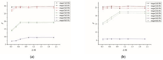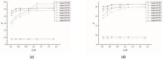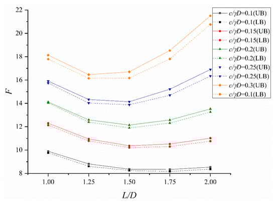 Figure 35 shows the influence of L/D on the safety factor, and curves of the upper and lower bounds of the safety factor under different c/γD are drawn in the figure. The data in the figure show that there is a nonlinear relationship between L/D and the safety factor F. With the increase in L/D, the safety factor under five different c/γD will first increase and then decrease, presenting a parabolic shape as a whole.