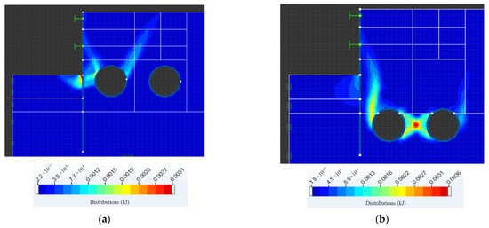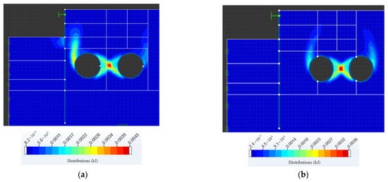 Shear dissipation contours under different horizontal distance L in stage (2): (a) L = 0.33 H and (b) L = 0.5 H.