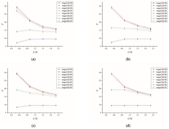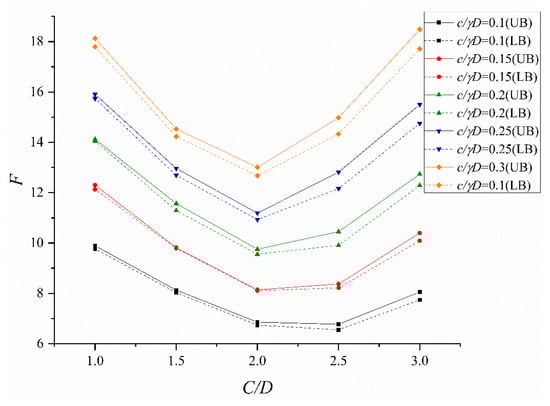 Figure 34 shows the influence of C/D on the safety factor, and curves of the upper and lower bounds of the safety factor under different c/γD are drawn in the figure. The data in the figure show that there is a nonlinear relationship between C/D and the safety factor F. With the increase in C/D, the safety factors under five different c/γD will first increase and then decrease, presenting a parabolic shape as a whole.